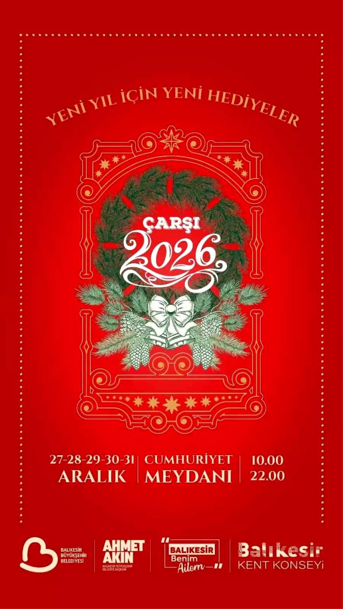 Balıkesir Büyükşehir Belediyesi ve Balıkesir Kent Konseyi iş birliğiyle düzenlenecek olan “Çarşı 2026” etkinliği için 27-31 Aralık tarihlerinde geri sayım başladı. Bu etkinlik, Balıkesir Büyükşehir Belediye Başkanı Ahmet Akın’ın liderliğinde gerçekleştirilecek ve beş gün boyunca birbirinden keyifli etkinliklere ev sahipliği yapacak.