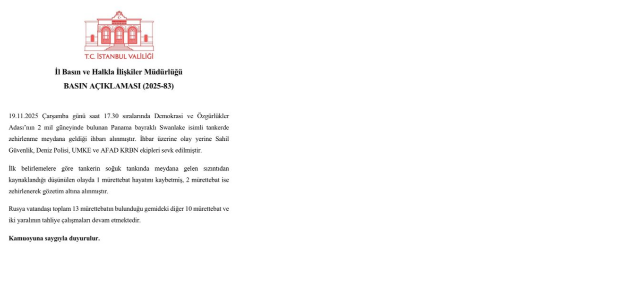 19.11.2025 Çarşamba günü saat 17.30 sıralarında Demokrasi ve Özgürlükler Adası’nın 2 mil güneyinde bulunan Panama bayraklı Swanlake isimli tankerde meydana gelen zehirlenme ihbarına ilişkin basın açıklamamız…