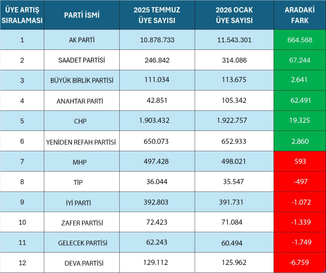 Yargıtay’ın güncel verilerine göre Türkiye’deki siyasi partilerin üye sayıları netlik kazandı. Büyük Birlik Partisi, üye sayısını yüzde 300’e yakın bir artışla 113 bin 675’e ulaştırarak dikkat çekti.